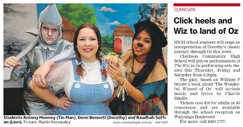 CCHS drama production "The Wiz", Thursday 6 August, Friday 7 August and Saturday 8 August. Doors open 6.30pm. Tickets available from reception, $10 adults / $5 concession. Hope to see you there!